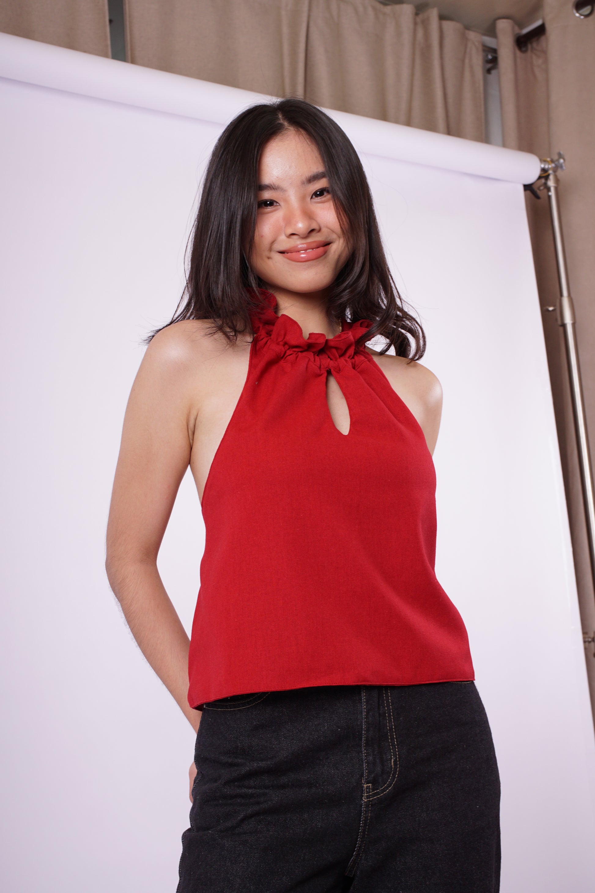 The CORA is a halter top with a keyhole neckline, designed to give an elegant silhouette. also features a soft ruffled collar for a feminine touch.